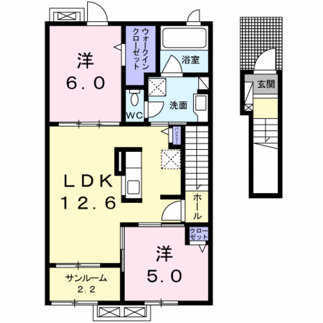 敷金0ヶ月/礼金60,000円/2階/軽量鉄骨/47.70m2